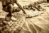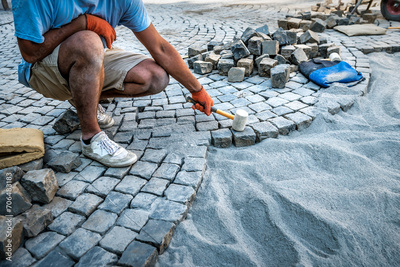 Construction worker installing and laying pavement stones on road or sidewalk. Worker using stones and rubber hammer to build stone sidewalk