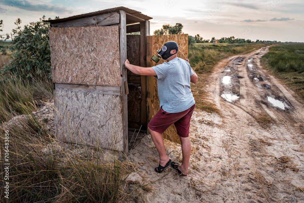 Man in black gas mask comes in of an old wooden village stinky toilet
