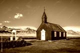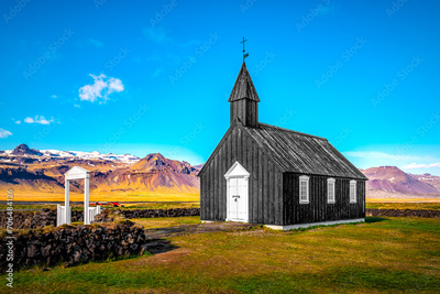 Picturesque autumn landscape with famous old black church of Budir at Snaefellsnes peninsula region in Iceland