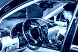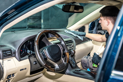 Specialist cleaning car interior with microfiber cloth. Professional detailing car