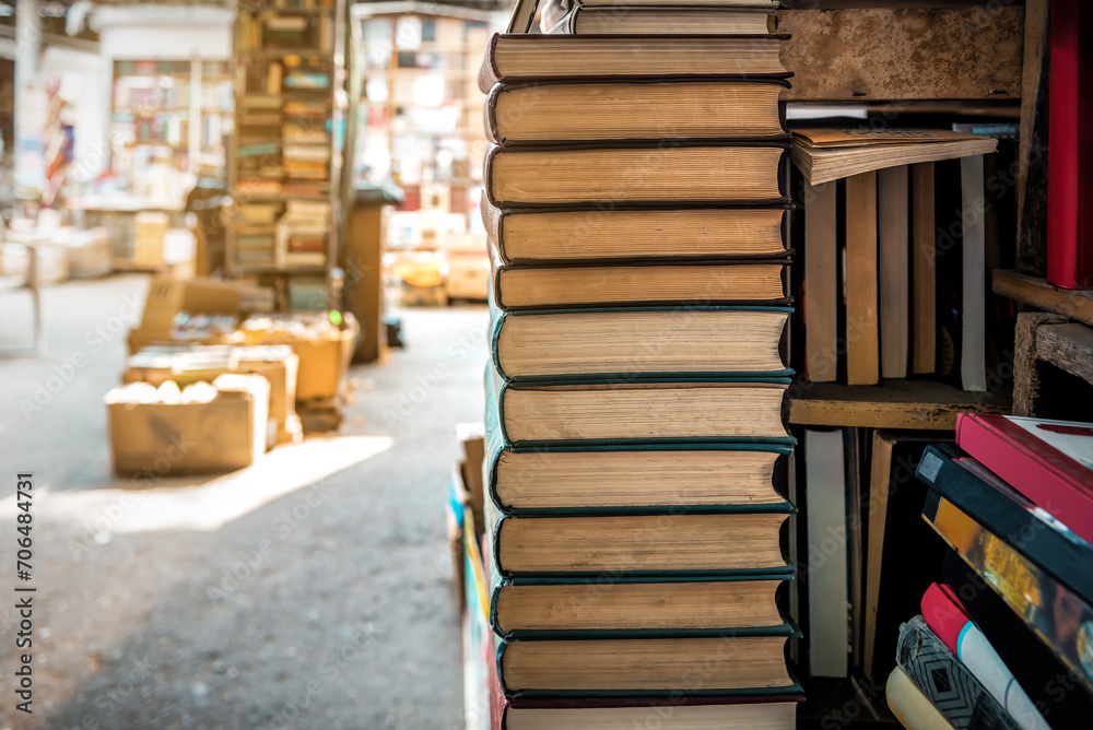 Stacks of different old books at the street book fair market