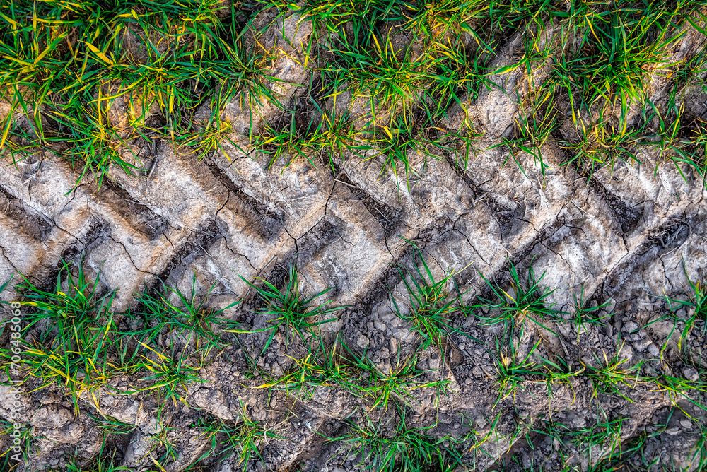 Track from a tractor tire on green field