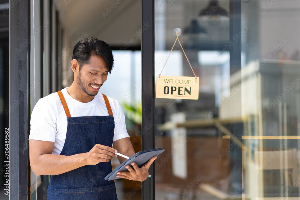 A young man a small start-up business entrepreneur who started a small restaurant. A waiter waits for a customer at the door of a coffee shop.