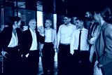 Attractive gray-haired Caucasian man team leader happy greeting staff various formal professionals standing in business center hallway. Group of office workers smiling looking at new ceo senior boss