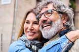 Close up Caucasian smiling pensioners love couple standing hugging together outdoors. Happy romantic adult people embracing. Man and woman looking at something affectionate enjoying retirement time