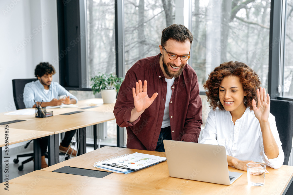 Gift concept. Joyful attractive brunette indian or arabian woman in casual orange shirt, stands on isolated white background, holding big gift box, happily looking at the camera and smiles friendly