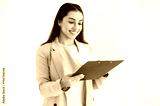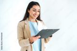 Confident positive brunette indian or arabian business woman, financial consultant, trader, stands on isolated white background, holding folder with documents and graphs, looking at it, smile friendly