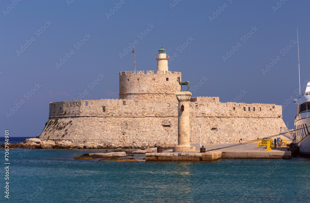 Old stone lighthouse illuminated by the sun at Fort St. Nicholas in Rhodes.