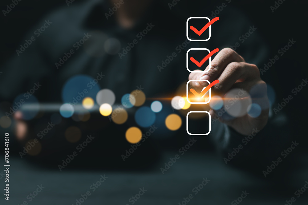 Businessman making correct sign mark on checkboxes to approve corporate project for business project approval concept.