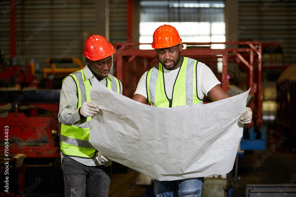 factory workers or engineers planning from work on blueprint drawing paper in the factory