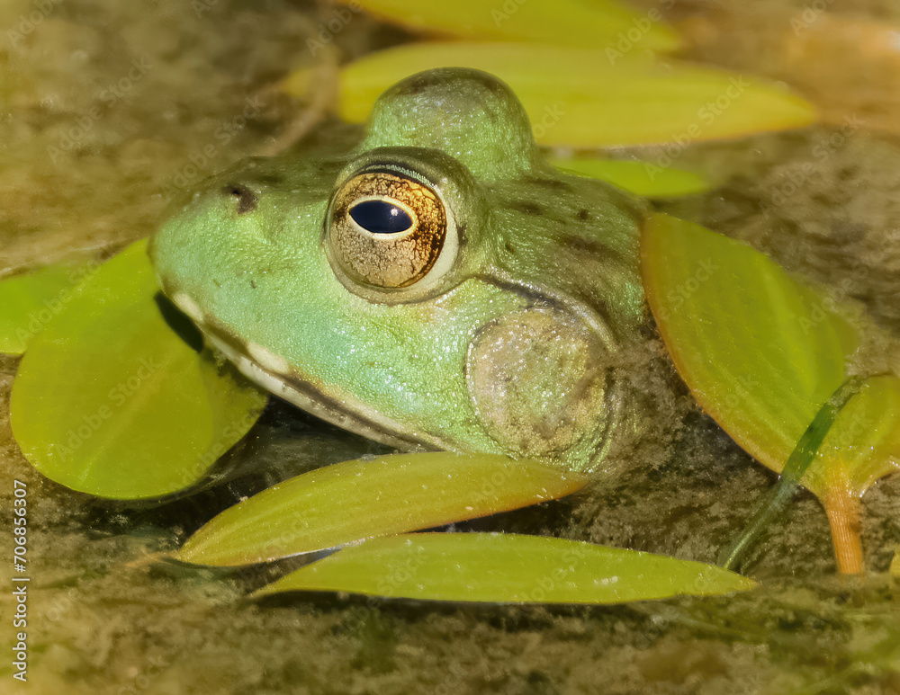 American Bullfrog Hiding in a Pond. Gerland Ranch Regional Park, Monterey County, California, USA.