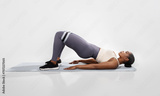 African American Woman Doing Glute Bridge Exercise Over White Background