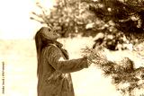 Young woman walks through the winter forest and admires spruce or pine tree. Girl in fur coat in nature.