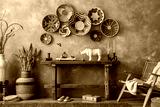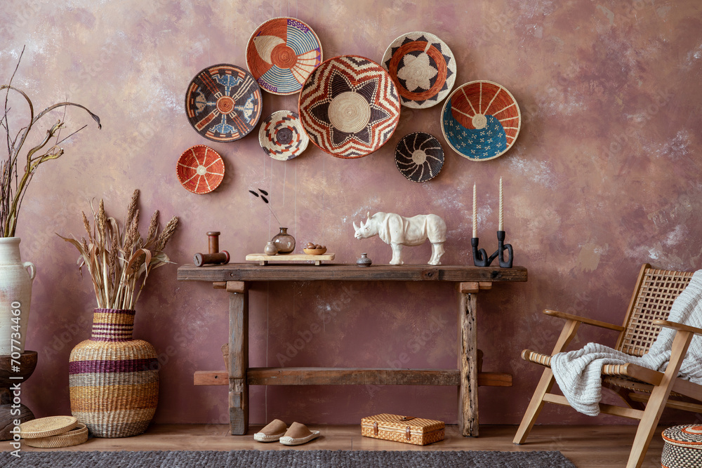 The stylish ethnic compostion at living room interior with wicker baskets, wooden bench, armchair and elegant personal accessories. Cozy apartment. Home decor. Template.