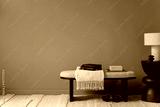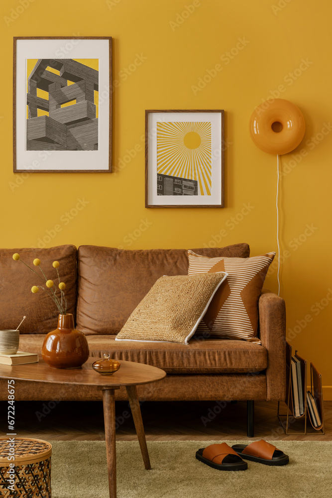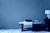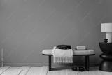 Minimalist composition of living room interior with stylish bench, black stand, gray plaid, carpet, blue wall and personal accessories. Home decor. Template. Copy space.
