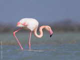 A Greater Flamingo walking in the water looking for food