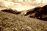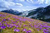 Dolina Chocholowska with blossoming purple crocuses or saffron flowers, famous valley in the High Tatra mountains, Poland. Scenic spring landscape, natural outdoor travel background