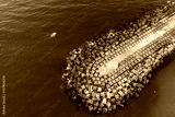 drone aerial view of a boat near a concrete block breakwater. Vila Praia de Ancora, Portugal