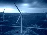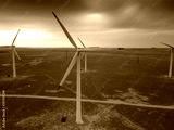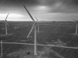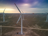 Autumn landscape from a drone. Wind turbines at sunset. Renewable energy sources, safe generation.