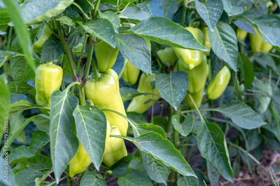 Green ripe sweet pepper in the garden. Organic farming. A small business growing sweet paprika in the garden.