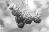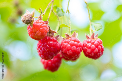 Red ripe raspberries on the branches of a bush in the garden. Organic berry on the farm. A healthy organic berry grown with love in the garden.