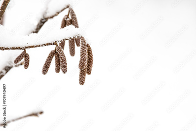 Hazelnut catkins under the snow. Hazelnut plantation in winter.
