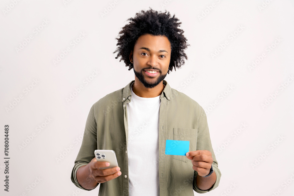 Cheerful guy using smartphone and credit card for shopping online. Happy man is ordering food online, male paying for long-awaited purchase on the mobile phone, isolated on white