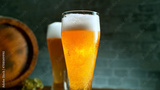 Freshly brewed beer in a pint on grey brickwall background, close-up
