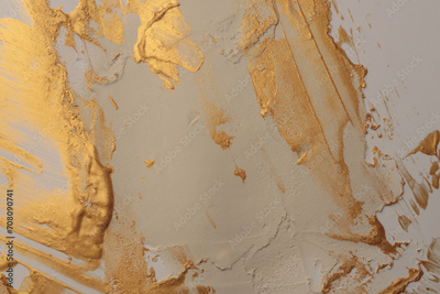 Art oil and acrylic smear blot canvas painting stucco wall. Abstract texture white, beige, gold glitter color stain brushstroke relief grain texture background
