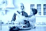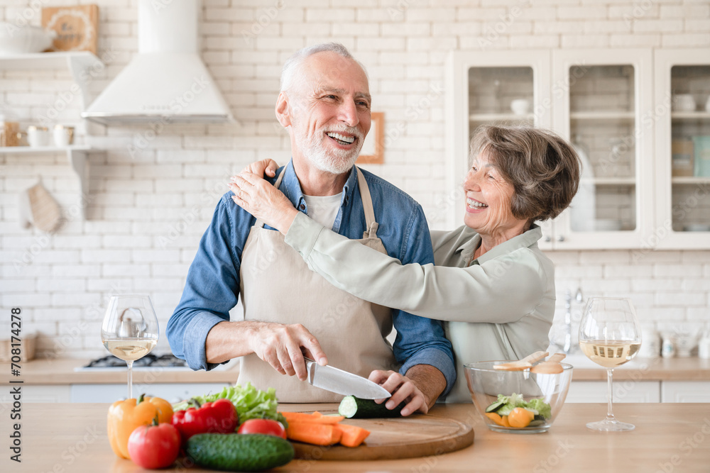 Happy cheerful caucasian old senior couple grandparents spouses hugging embracing helping prepare food meal cooking dinner, cutting vegetables at home kitchen together