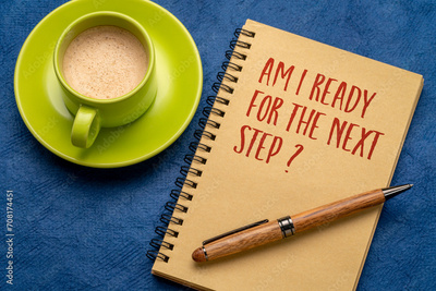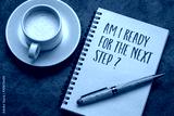 Am I ready for the next step? Self reflection question in a notebook. Personal development or career concept.