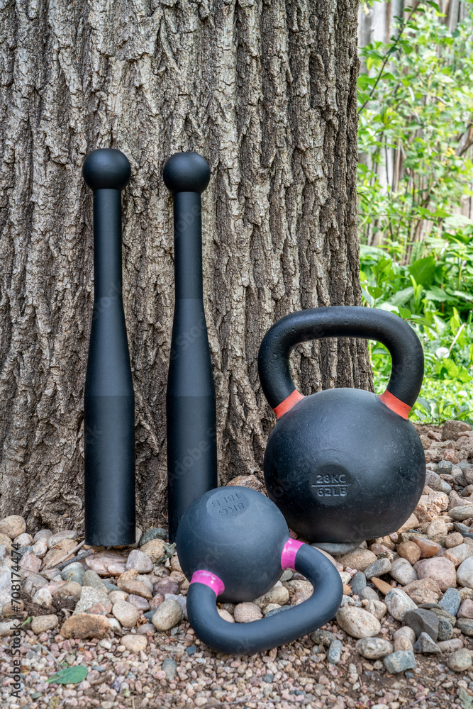 steel clubs and kettlebells in backyard, functional fitness and homer gym concept