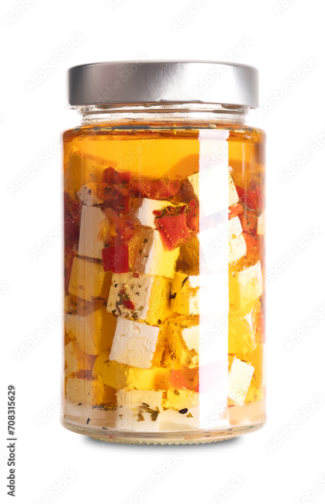 Feta cubes in oil, with red pepper and chili pieces, in glass jar. Greek cheese, matured in brine, with soft, moist texture, fresh, salty and acidic taste, cut in block shape, preserved in spiced oil.