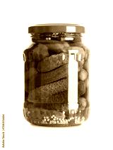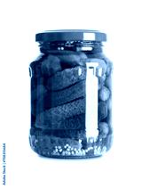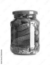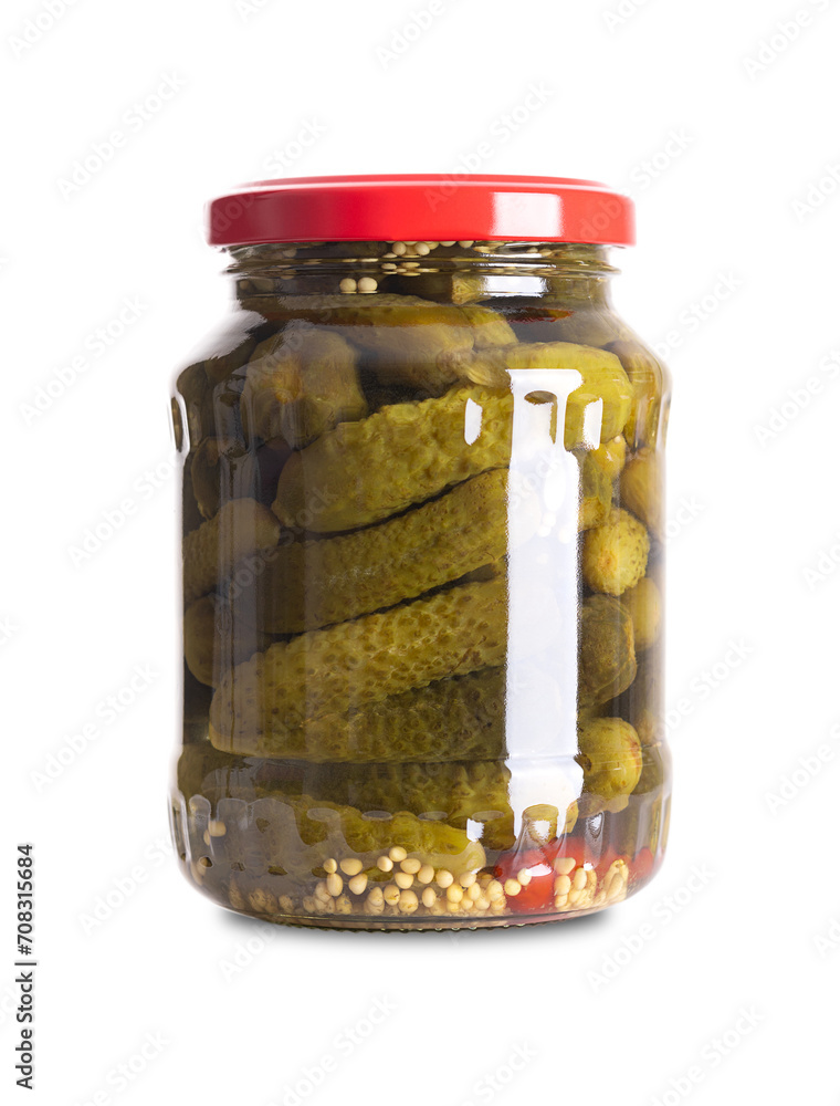 Cornichons, pickled gherkins in a glass jar. Crunchy pickles. Small cucumbers, pasteurized and preserved in brine of vinegar, salt, mustard seeds and chilis. Close-up, front view on white background.