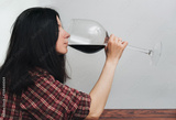 A young woman in a plaid shirt holds a large glass of red wine in surprise and begins to drink from it. Concept of alcohol abuse, alcoholism, hangover, loneliness and depression. Gray background.