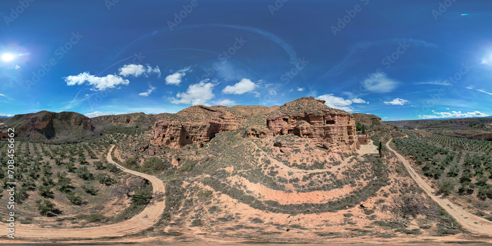 360 Pano VR image. Troglodyte city excavated in the mountain. Ancient medieval caves in the mountains. Panoramic aerial view. Andalusia. Spain.