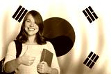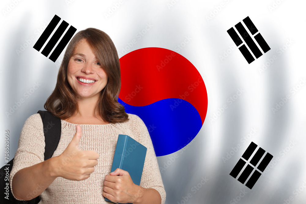 Happy woman student against Korean flag background. Travel, education and learn language in South Korea concept