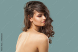 Attractive healthy fenale model with clear fresh skin. Brunette woman with dark hair on blue background