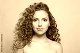 Beautiful young female model healthy woman with long wavy frizzy hairstyle and clear skin studio portrait. Hair care, facial treatment and cosmetology concept