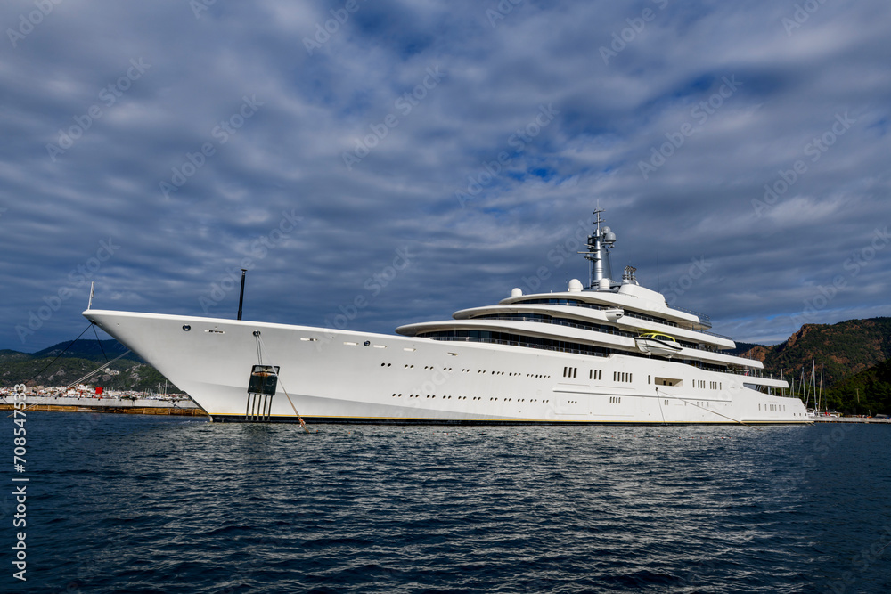 Luxury super yacht moored alongside in marina. Motor yacht. Large mega yacht. Yachting concept.