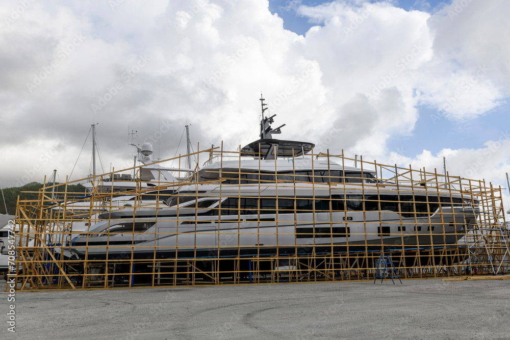 Luxury super yacht ashore on ship repairing yard. Yard period. Repairing. Motor yacht.