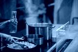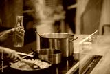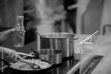 Hot steam coming out boiling metal pot in professional cooking kitchen with chef in the background