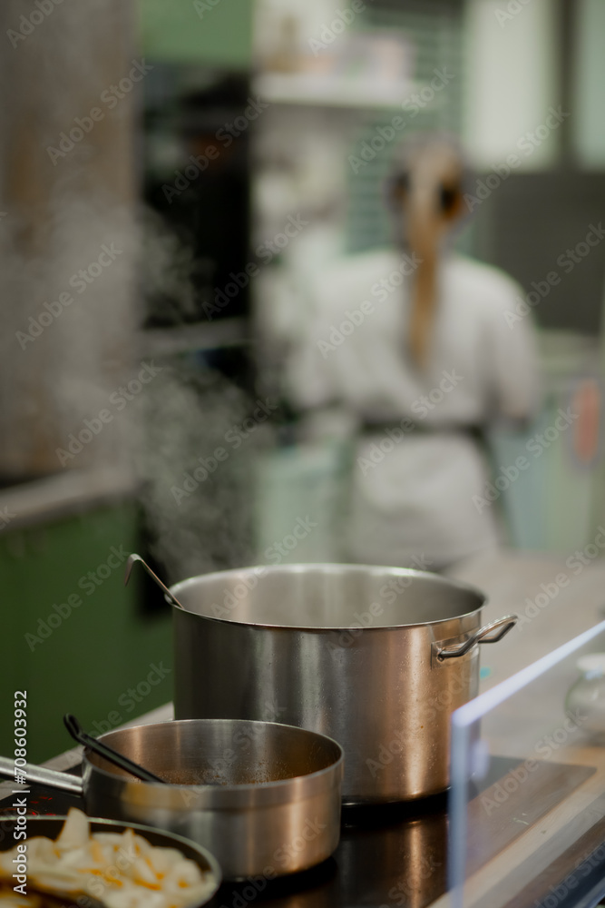 Hot steam coming out boiling metal pot in professional cooking kitchen with chef in the background