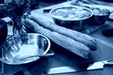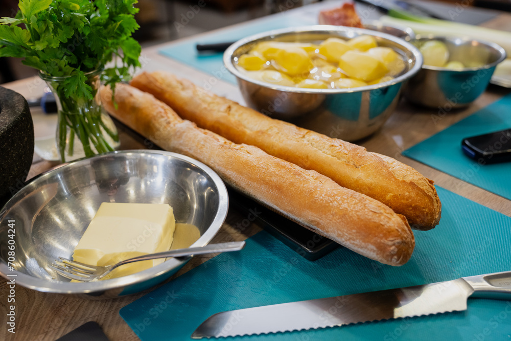 French baguettes, butter and peeled potatoes in kitchen for preparation of delicious meal