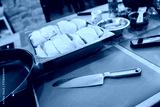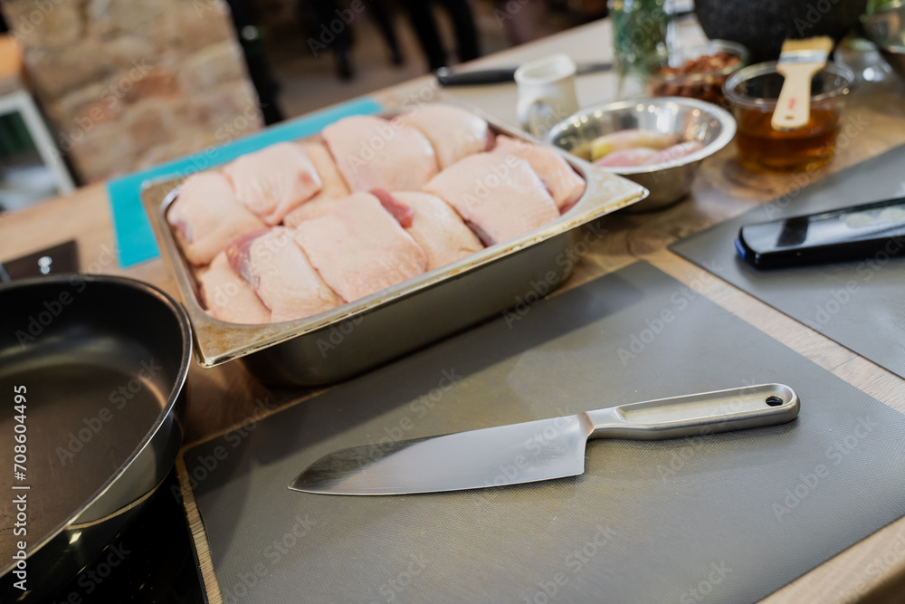 Raw duck breasts prepared for cooking on chefs kitchen with knifes and different ingredient foods