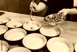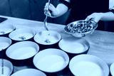 Professional cook filling soup dishes in restaurant for clients that have ordered