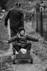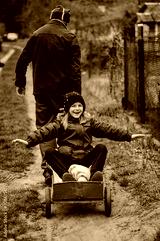 A strong man, father, grandfather rides, carries on a rusty old cart, wagon along the road in the village, countryside, a small beautiful smiling, happy girl, child. Photography, close-up portrait.