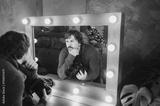 An adult mustachioed man, a professional photographer with a camera in his hands, stands in front of a mirror with lamps admiring himself. Photography, portrait, lifestyle.