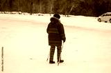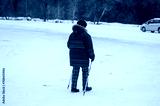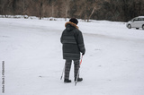 An adult, elderly woman with aluminum hiking sticks walks along the road in winter on white snow on the street outdoors in the forest. Photography, healthy lifestyle concept, outdoor sports.