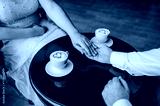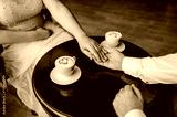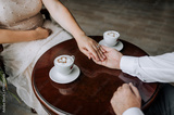 An adult man, groom and woman bride are sitting at a wooden table in a cafe holding hands with cups of milk coffee and a foam heart. Wedding photography, food, ceremony, romantic dinner.